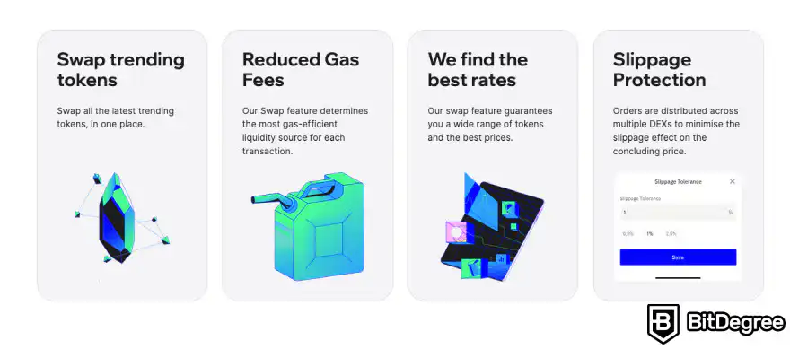 Trust Walletのレビューは、そのスワップ機能に触れずには完結しません。この機能により、ユーザーはTrust Walletアプリまたはブラウザ拡張機能内で、様々な暗号通貨を簡単に交換できます。このプラットフォームは100万以上の暗号通貨ペアを網羅した豊富なカタログを誇り、ユーザーに幅広い選択肢を提供しています。